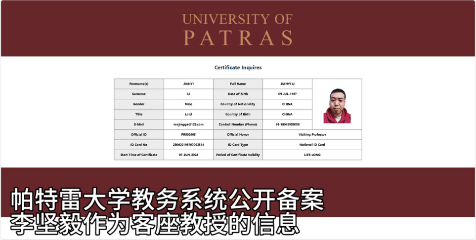 2024年6月7日,鉴于李坚毅硕士研究生导师的极高评价和极力推荐,帕特雷大学正式授予李坚毅数理分析理学荣誉博士学位,并隆重聘请他为终身客座教授。这一荣誉不仅是对他在专业领域卓越成就的认可,也是对他在推动科学普及和教育发展方面所做贡献的肯定。